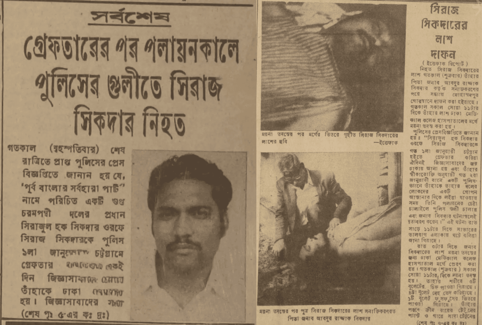 ইত্তেফাকের প্রথম পাতায় দুই কলামে শিরোনাম, 'গ্রেপ্তারের পর পলায়নকালে পুলিশের গুলিতে সিরাজ সিকদার নিহত'। দৈনিক বাংলার সংবাদ শিরোনাম ছিল 'সিরাজ সিকদার গ্রেপ্তার: পালাতে গিয়ে নিহত'।